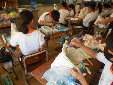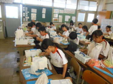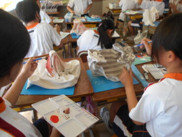 2025.9.19 4年生 4年 図画工作 9/19 4年生は、図画工作科で液体粘土を使った作品づくりに取り組んでいます。 液体粘土に浸して固まった布の形から想像力を膨らませ、自分が見立てた世界を思い思いに色や飾りで表現しました。