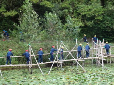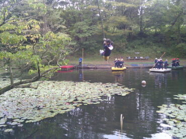 まず、森の木ウォークラリーの活動を行いました。地図を見ながら森の中を探索し、目的の木を見つけて特徴を書き記しました。次に、いかだやターザンロープに乗って、自然を全身で満喫しました。