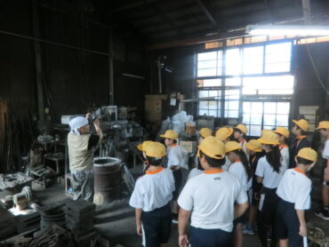 次に金屋町方面に向かいました。鋳物資料館や鋳物工房 利三郎を見学しました。工房の様子を見たり、お話を聞いたりして、ものづくりへのイメージを膨らませました。