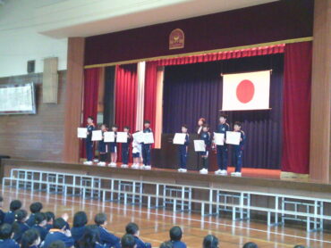2025.11.26 全校生 授賞式 11/26 授賞式を行いました。 夏休みから2学期にかけて、芸術や科学、防災の分野で優秀な成績を収めた児童やランニングチャレンジで新記録を樹立した児童の頑張りを称えました。