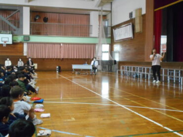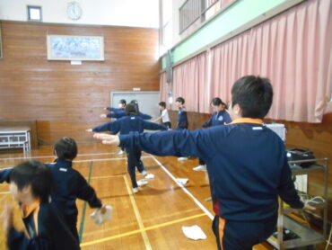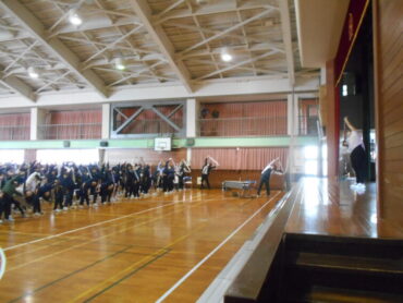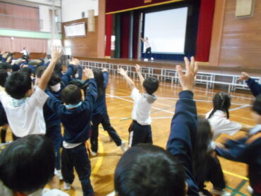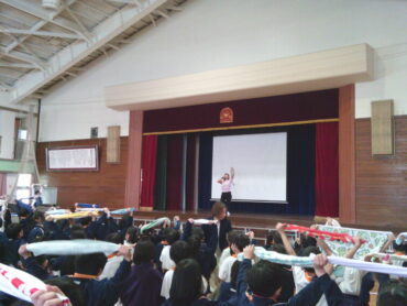 スポーツインストラクターの先生からは、姿勢をよくするためのタオルを使った運動を教えていただき、実際に全校でやってみました。