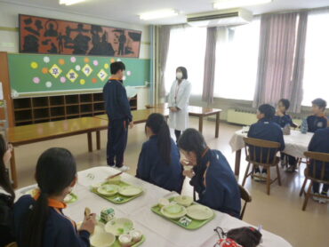 途中、調理員さんたちをお招きし、いつもおいしい給食を作ってくださる皆様に、日頃の感謝の気持ちを伝えました。